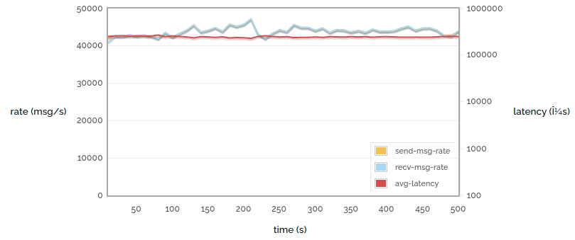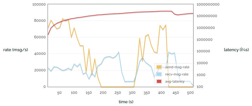 (The small drop in latency around 440s is due to all the messages published before 200s being consumed, and the long gap afterwards.)