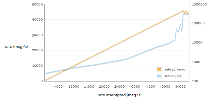 In the charts above we were running as fast as we can, but here we limit the rate at varying points up to the maximum rate we can achieve. So the yellow line shows rate attempted vs rate achieved - see that it goes most of the way purely 1:1 linearly (when we have spare capacity and so if we try to publish faster we will succeed) and then stops growing as we reach the limit of what we can do.