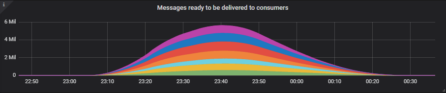 The message backlogs can grow into the tens of millions as this is a high traffic system where backlogs can form fast. We shall see an S shape to the consume rate as first the processing time increases, then decreases and consume rate then exceeds the publish rate as the consumers process the backlog.